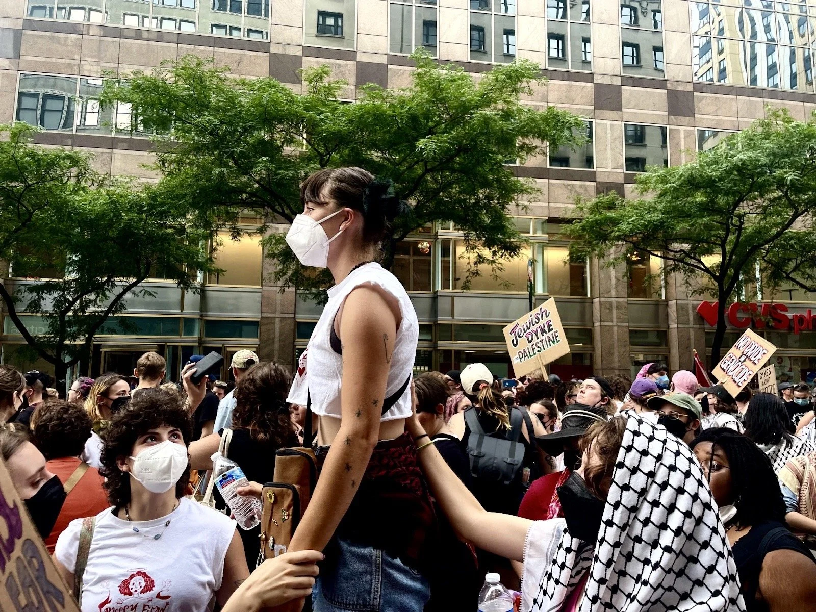 The organizers gathered in front of the New York Public Library presented in all shades of rainbow—from the flaming sunset-colored lesbian flag to the cool blues, purples, and hot pinks of the bisexual flag, to the pastels of the transgender flag. This year, streaks of black, green, and red and posters of watermelons, a symbol of Palestinian expression, could be spotted among the crowd.