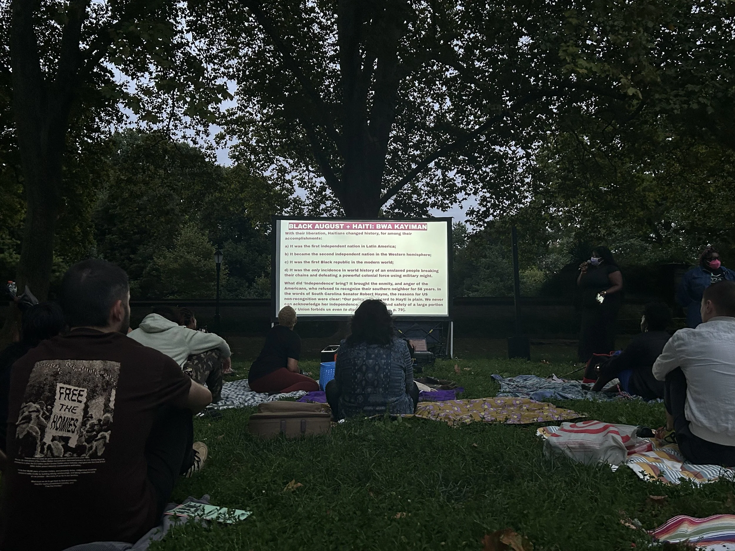 On Friday evening, attendees of the “100 Year Class War on Haiti” political education session and short film screening in Prospect Park, Brooklyn, gathered around a projector, sitting on blankets and holding pamphlets. The title projected onto a screen read, “100 Year Class War of Haiti,” a powerpoint about the political and economic history of Haiti, including the roles of colonialism and consumerism.